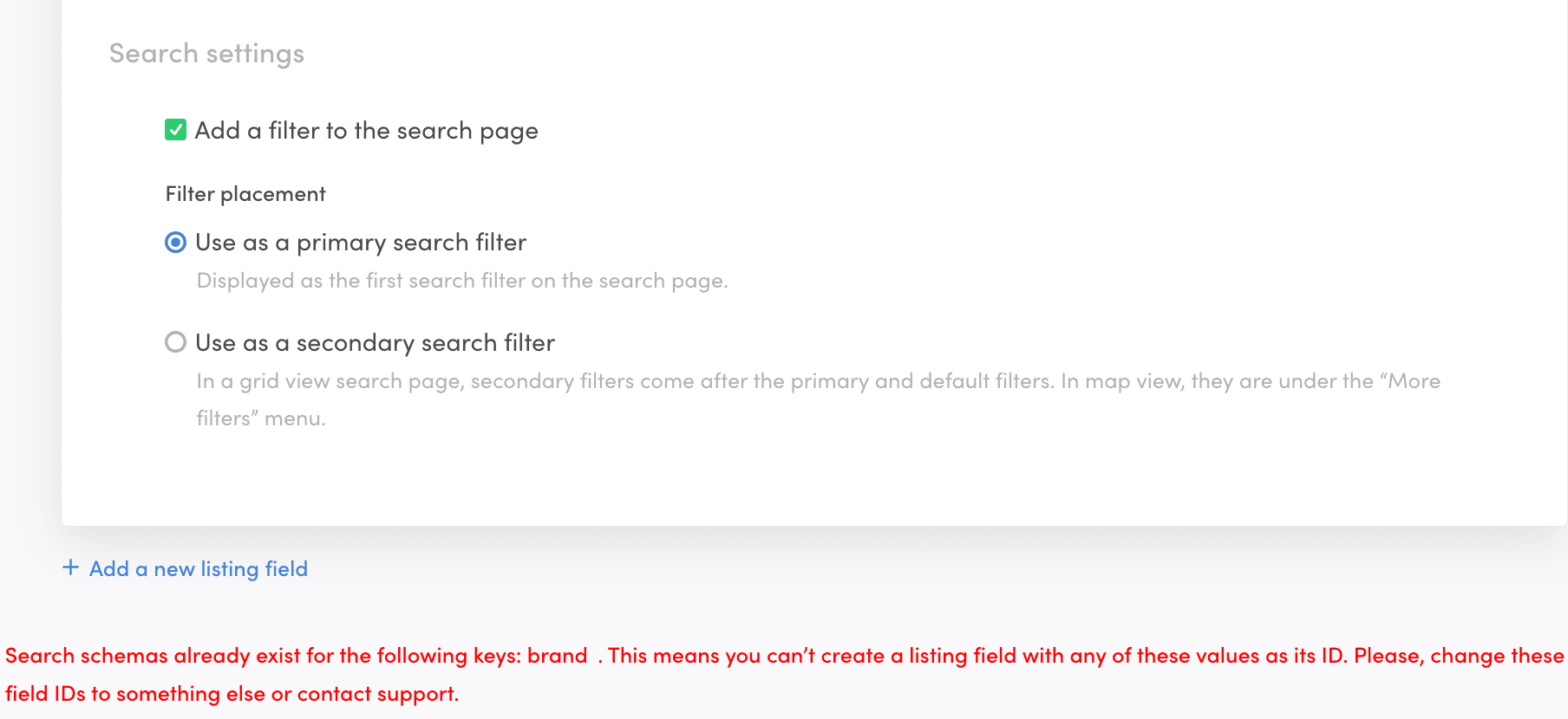 › API call failed. Status: 409, reason: A search schema with the same key and scope has already been defined in an asset.Adding listing search schemas