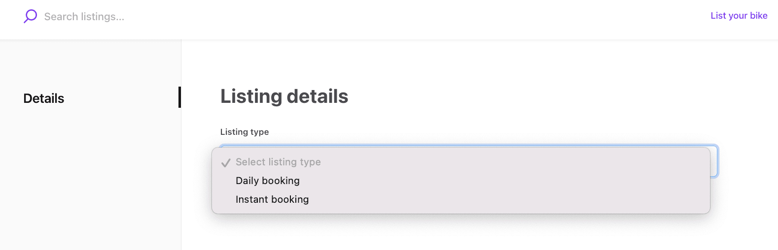 Now if you start creating a new listing, you will see a dropdown of listing types. One of the listing types comes from Sharetribe Console, and the other comes from our built-in configuration.
