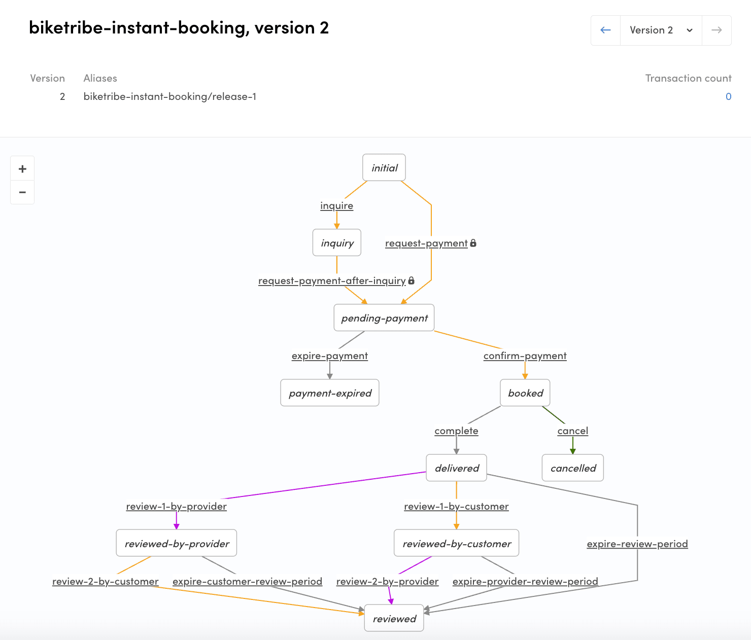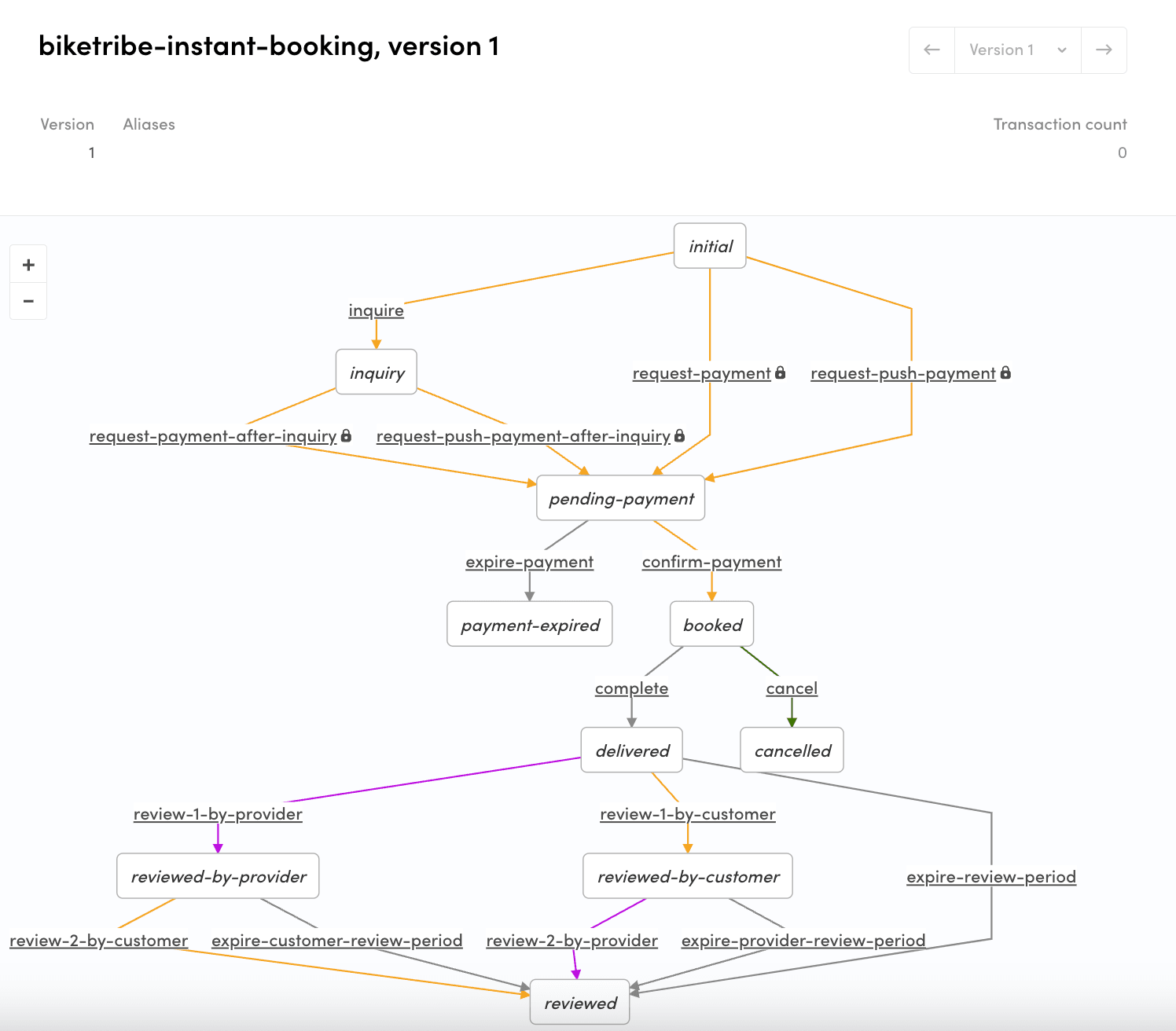 flex-cli process update-alias --alias=release-1 --process=biketribe-instant-booking --version=2 --marketplace=biketribe-devNow, if you open the process graph from the Sharetribe Console, you'll see that the push payment transitions have been removed from the process.